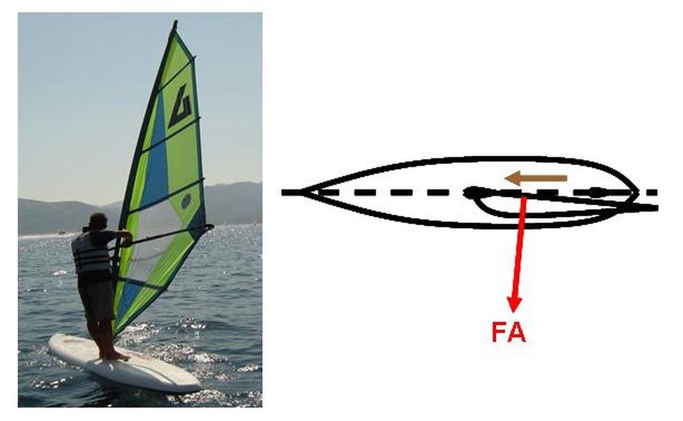 Le véliplanchiste est en opposition penché vers l’avant du flotteur, ses bras sont tendus vers l’arrière. Le gréement est vers l’arrière du flotteur. La chute du gréement se ferme (commande porte) progressivement.