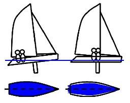 • Sur le troisième dessin, la gîte a augmenté (renforcement du vent par exemple). Les deux axes sont de nouveaux alignés, l’axe du centre de carène s’étant rapproché de l’axe du centre de gravité. Le bateau est en équilibre. S’il n’y a pas de modifications dues à la variation de l’intensité du vent ou (et) au déplacement de l’équipage, le bateau ne gîte pas plus mais ne revient pas non plus à plat.