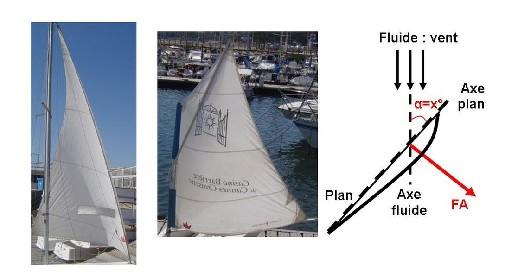 La création d’une force aérodynamique FA dépend de l’angle entre le fluide (vent) et le plan (voile). Cet angle est noté alpha : α. On l’appelle l’ angle d’incidence.